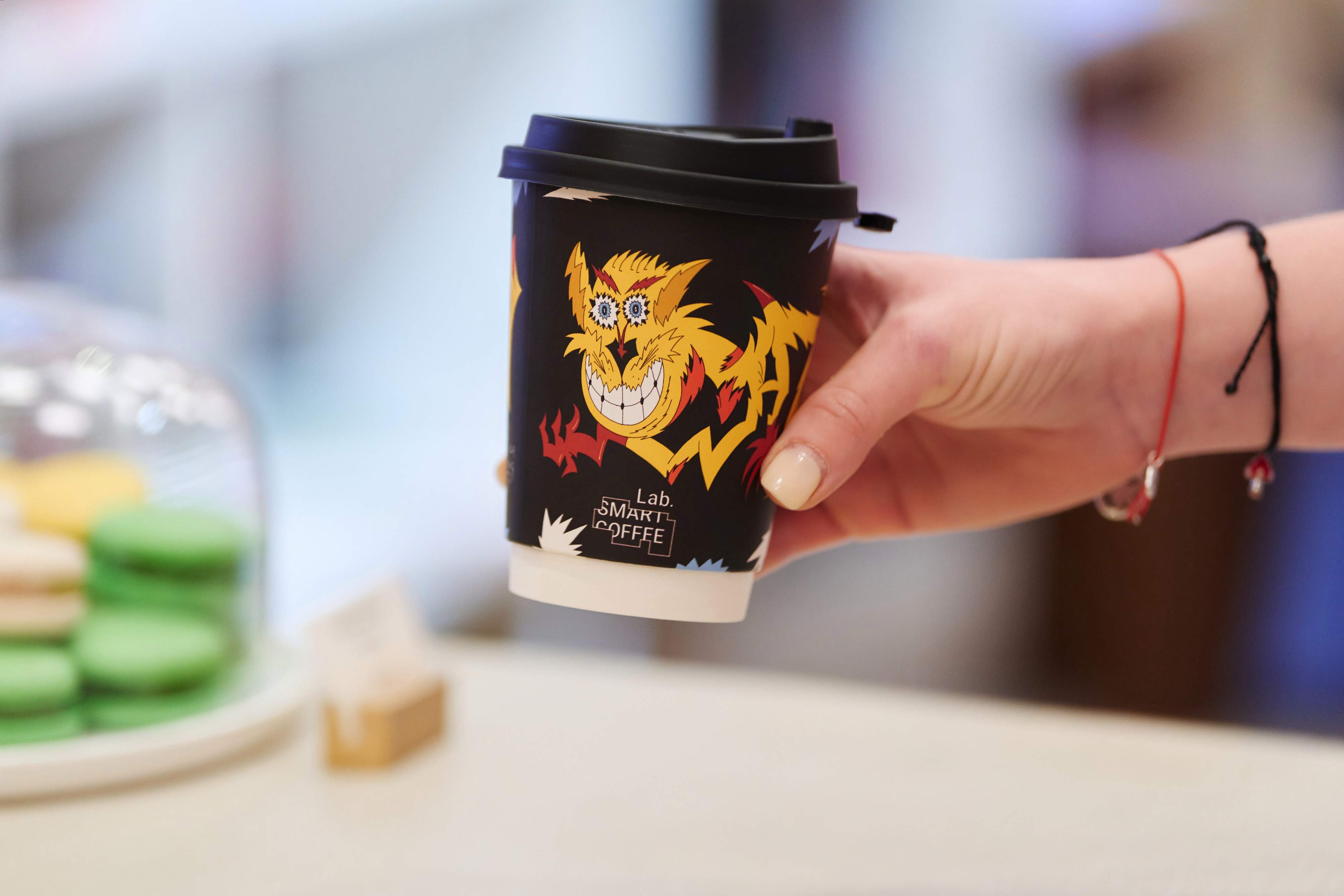Обратите внимание на стаканчики, дизайн которых разработан специально к открытию с современным художником Вовой Перкиным.